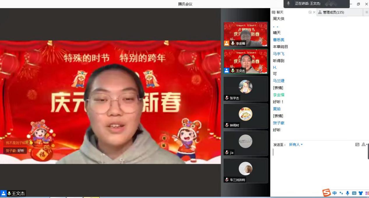 热议结束后,各年级分别组织了一次别开生面的云端跨年活动。2021级,20余名同学精心准备、协同合作,为大家带来了歌曲表演、三句半、体能展示等10一个节目;2020级,为同学们准备了贺岁观影、掌上欢乐和群雄逐鹿三个环节的游戏,同学们可以按照自己的爱好和特长,选择自己喜欢的游戏项目;2019级,在活动中设计了最感动的瞬间分享、你画我猜、才艺展示、新年祝福等环节,师生云端相聚、共迎新年;2018级,邀请同学们做《回顾2021,展望2022》分享和才艺展示,并为每位展示分享同学送上一份新年礼物,整个活动过程暖意融融、和谐融洽。
