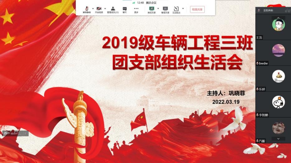3月19日下午,无限动漫 2019级车辆工程三班团支部通过腾讯会议召开了专题组织生活会及团员评议,车辆三班团支部全体成员参加会议。会议由团支部书记巩晓菲主持。