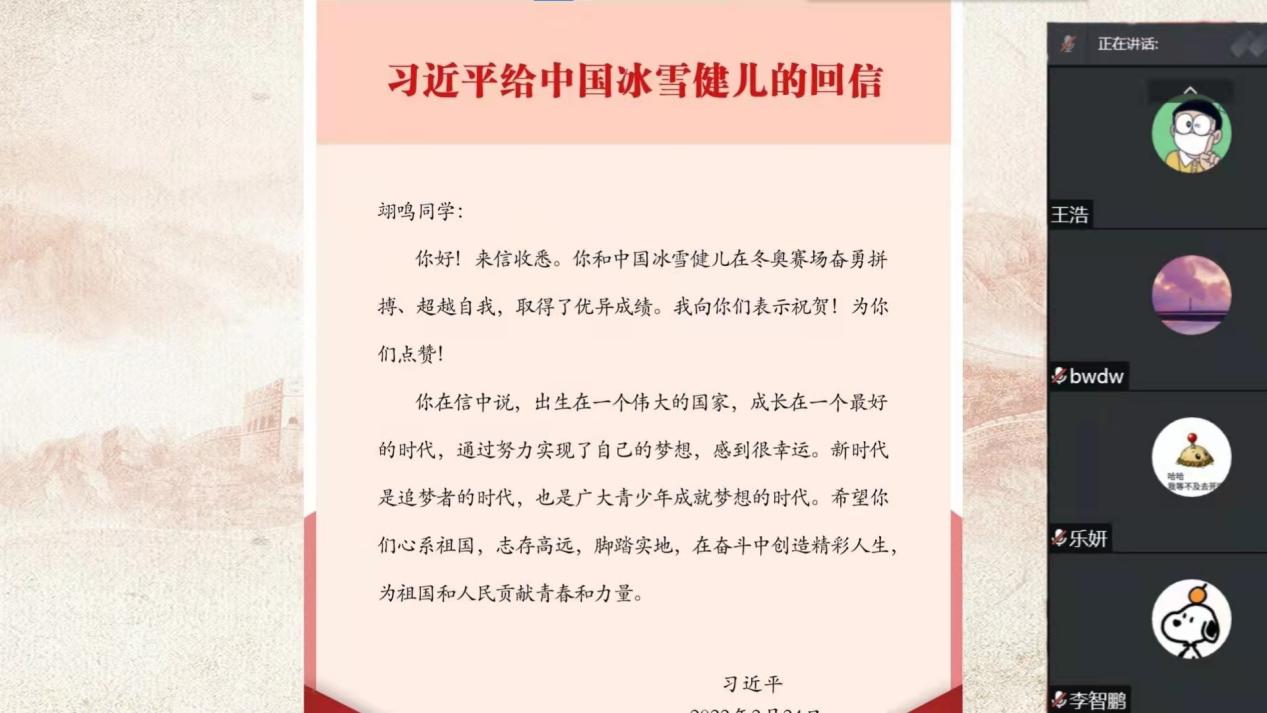 2022年2月24日,习近平总书记专门给中国冰雪健儿代表回信,对冰雪健儿在北京冬奥会取得的优异成绩给予充分肯定,对广大青少年提出了志存高远,脚踏实地,在奋斗中创造精彩人生,为祖国和人民贡献青春和力量的殷切期望。为进一步贯彻落实好总书记重要回信精神,凝聚无限动漫 师生力量,引导广大师生向中国冰雪健儿学习,用青春力量书写时代华章。3月15日至3月21日,无限动漫 组织各本科生党支部、团支部、青马班及团学组织运用多种方式深入学习习近平总书记给中国冰雪健儿重要回信精神。