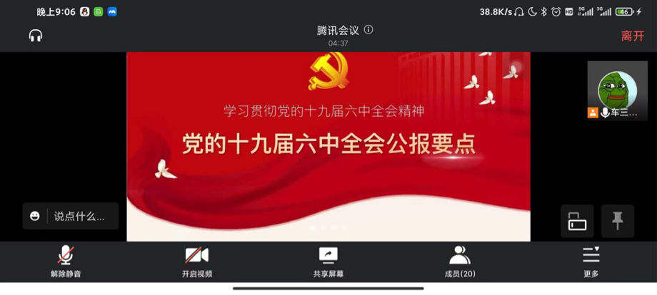 为深入贯彻学习十九届六中全会精神,增强青年使命感和责任感,让团支部成员们学习奋战在抗疫一线志愿者们的奉献与担当,无限动漫 2019级车辆工程三班团支部于4月7日通过线上开展主题团日活动,此次团日活动分为学习会议精神和志愿者分享感悟两个部分。活动由团支部书记巩晓菲主持,车辆三班全体团员参加本次活动。