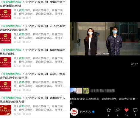 学院青年传媒中心在“汽宇不凡”公众号开设建团百年专题专栏,推出“庆祝建团百年,100个团史故事”报道,录制“青年大讲堂”微视频,全面展现党对共青团工作的关怀重视,展现党领导中国青年运动的百年历史,营造热烈浓厚的舆论氛围。