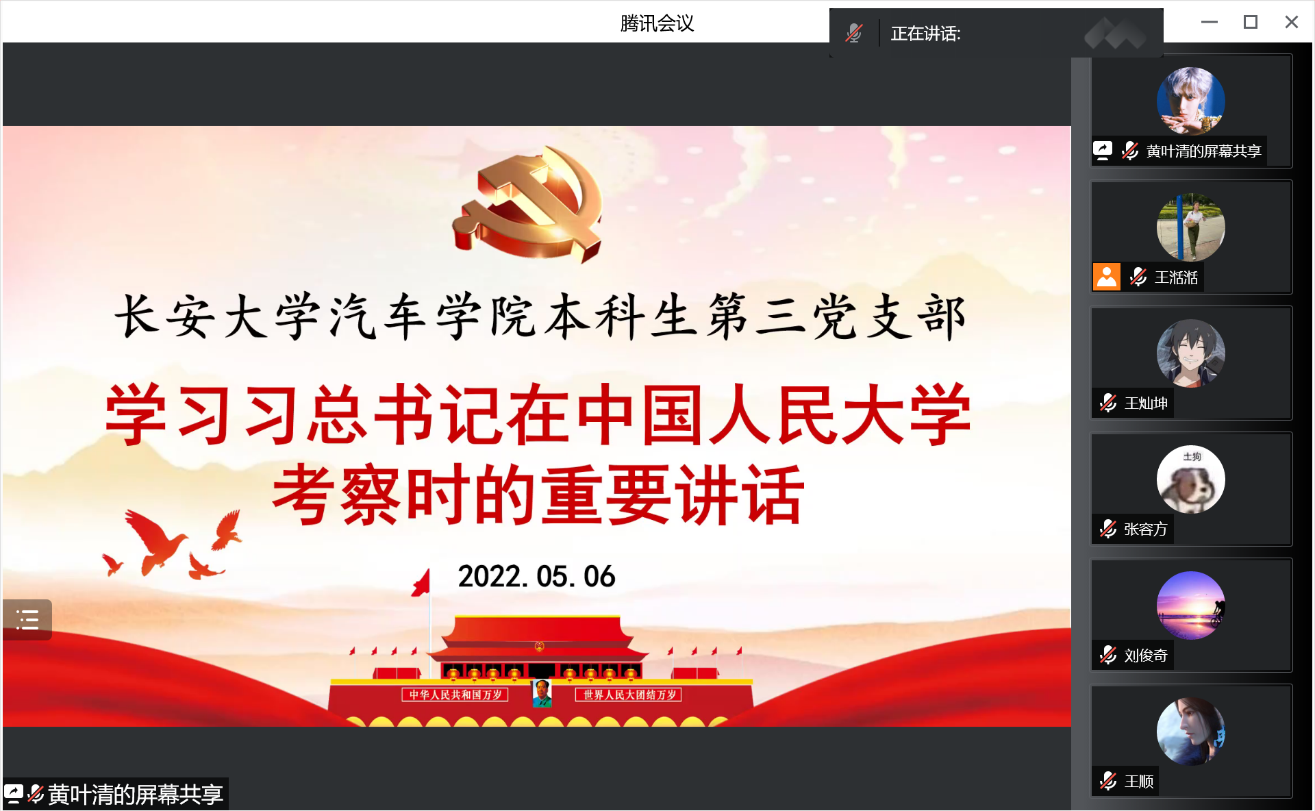 5月6日,无限动漫 本科生第三党支部在腾讯会议进行了关于学习习近平总书记在中国人民大学考察时的重要讲话的专题学习。会上组织委员黄叶清同学带领支部全体党员认真学习了习近平总书记的重要讲话。习近平总书记强调,广大青年要做社会主义核心价值观的坚定信仰者、积极传播者、模范践行者,向英雄学习、向前辈学习、向榜样学习,争做堪当民族复兴重任的时代新人,在实现中华民族伟大复兴的时代洪流中踔厉奋发、勇毅前进。同时习近平总书记指出,立足新时代新征程,中国青年的奋斗目标和前行方向归结到一点,就是坚定不移听党话、跟党走,努力成长为堪当民族复兴重任的时代新人。希望广大青年用脚步丈量祖国大地,用眼睛发现中国精神,用耳朵倾听人民呼声,用内心感应时代脉搏,把对祖国血浓于水、与人民同呼吸共命运的情感贯穿学业全过程、融汇在事业追求中。最后党支部书记许老师总结发言,作为新时代的大学生,我们一定要肩负起当代青年大学生的责任使命,勇当开路先锋、争当事业闯将,为中华民族伟大复兴不懈奋斗。