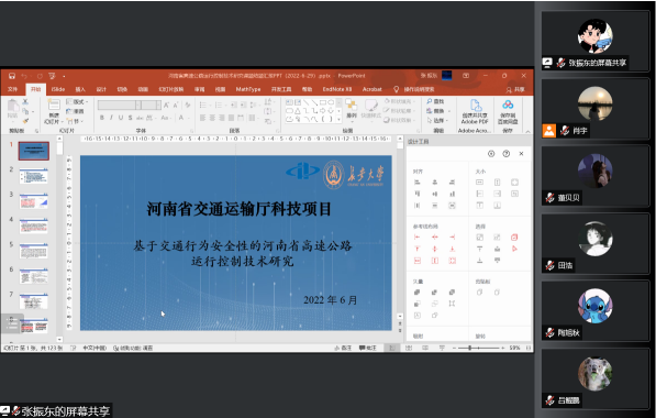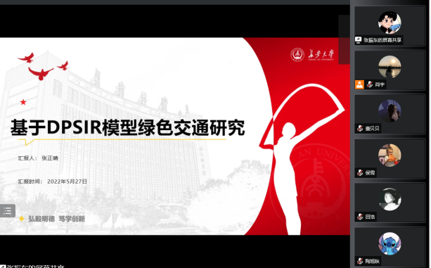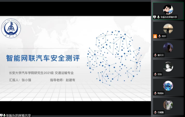 此后,硕士研究生张正晴作了《基于DPSIR模型的绿色交通研究》的报告,基于DPSIR模型,聚焦城市绿色交通问题,研究了关中城市群绿色交通水平的空间演化分布特征;张小强同学汇报了题为《智能网联汽车安全测评》的学习成果,对目前智能网联汽车的绿色发展态势以及面临的挑战进行了分析,介绍了中汽院智能网联汽车公司对于智能网联汽车安全测评的新产品,提供了解决测评技术痛点问题的新思路;肖宇同学从方法论的角度,结合机动车能源消耗及排放测定数据,分享了论文写作中常用的数据处理及分析方法;刘清云同学对导师组的河南省交通厅科技项目进行了结题预演汇报。