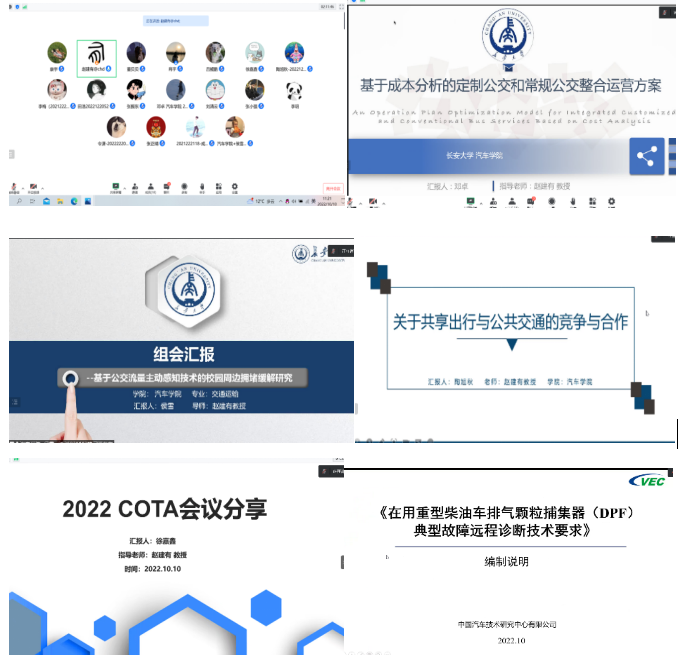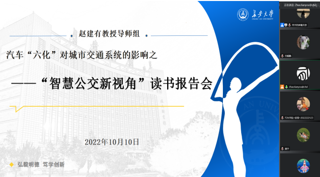 2022年10月10日上午9:00,赵建有教授导师组“汽车‘六化’对城市交通的影响之一-—智慧公交新视角”读书报告会线上举行,会议由赵建有教授主持,导师组全体成员参加。