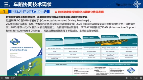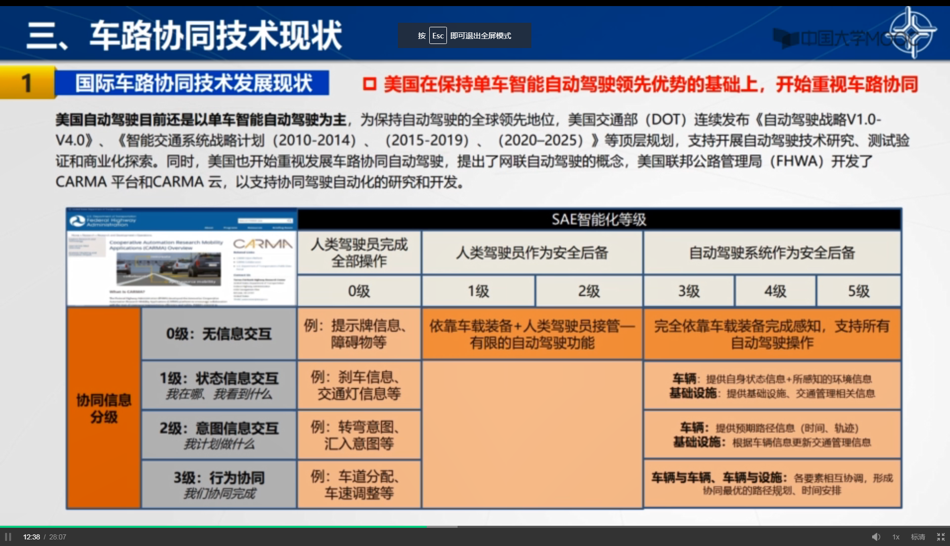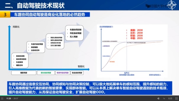 “面向自动驾驶的车路协同关键技术”课程中,刘建蓓院长从什么是自动驾驶、自动驾驶技术现状开始,重点针对车路协同技术现状以及车路协同关键技术和初级阶段车路协同及应用等方面进行了详细的介绍,讲解了根据自动驾驶等级对道路的分类,道路基础设施对自动驾驶支持的级别,封闭测试场地及开放测试道路的状况,在空间、时间、类型三个维度车路协同的优势,道路信息采集对驾驶安全性的增强,C-V2X在时延、可靠性、连接数上的优势,车路协同对货车车队的支持,最后对车路协同自动驾驶规模化商业化落地应用前景做了展望。