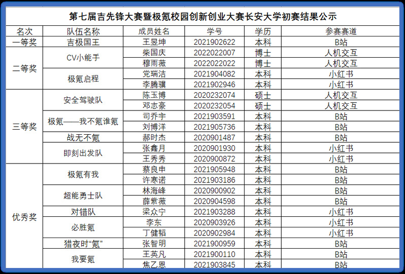 经过最终评比,获得一等奖的队伍为吉极国王队;获得二等奖的队伍为CV小能手和极氪启程队;获得三等奖的队伍为安全驾驶、极氪——我不氪谁氪、战无不氪和即刻出发队,获得优秀奖的队伍若干。