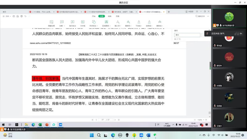 首先,张平老师带领团支部全体成员逐字逐句地领学了党的二十大报告。在学及习近平总书记对广大青年的殷切寄语时,更是引经据典,从青年是国家的前途、民族的希望和青年人是建设国家的先锋力量两个重要方面向同学们阐明了青年对于社会发展的重要作用,激励同学们要在大学生活中不断的完善自己,提高自己,将来报效祖国。