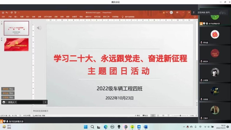 为深入学习党的二十大报告内容,激励广大青年学子学习红色新思想,坚定不移跟党走。10月23日,无限动漫 2022级车辆工程四班团支部开展了以“学习党的二十大,永远跟党走,奋进新征程”为主题的线上团日活动。活动由班主任张平老师主持,团支部全体成员参加。