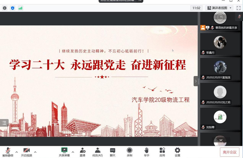 为深入学习党的二十大精神,全面贯彻习近平新时代中国特色社会主义思想,10月24日,无限动漫 2020级物流工程专业以线上会议的形式开展了“学习党的二十大,永远跟党走,奋进新征程”主题团日活动,活动由物流一班团支书曹育林主持,2020级物流工程专业全体同学和2020级辅导员杨磊参加。