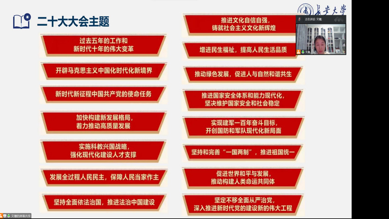 其次,张老师带领同学们简单回顾了中国共产党第二十次全国代表大会的内容,鼓励同学们高举中国特色社会主义伟大旗帜,弘扬伟大建党精神,坚持真理、坚守理想、践行初心、担当使命,为全面建设社会主义现代化国家、全面推进中华民族伟大复兴而团结奋斗。