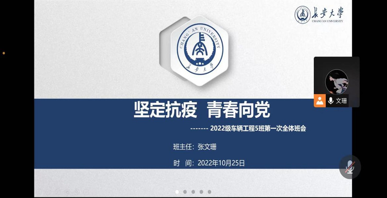 为增强防疫意识,深入了解党的二十大报告内容,解决大学生活与学习问题。10月25日晚,无限动漫 2022级车辆工程五班开展了以“坚定抗疫,青春向党”为主题的线上主题团日活动。活动由班主任张文珊老师主持,团支部全体同学参加。
