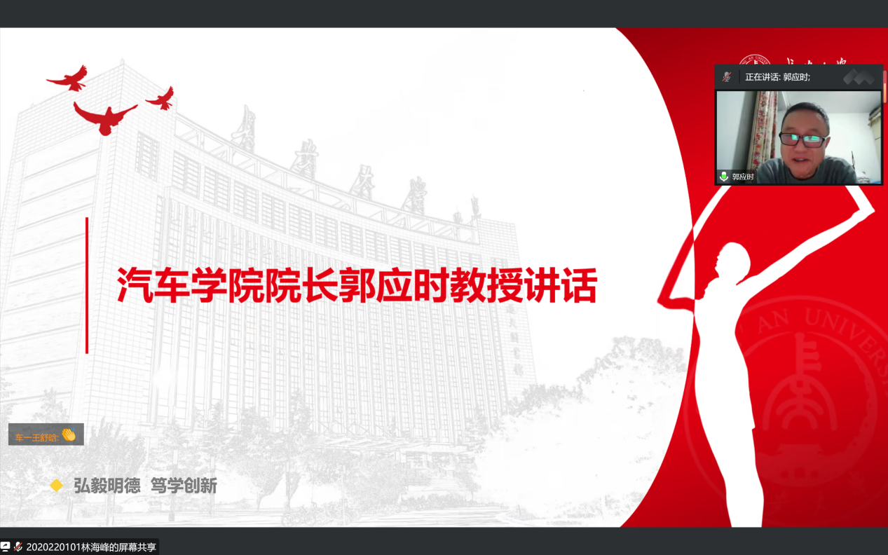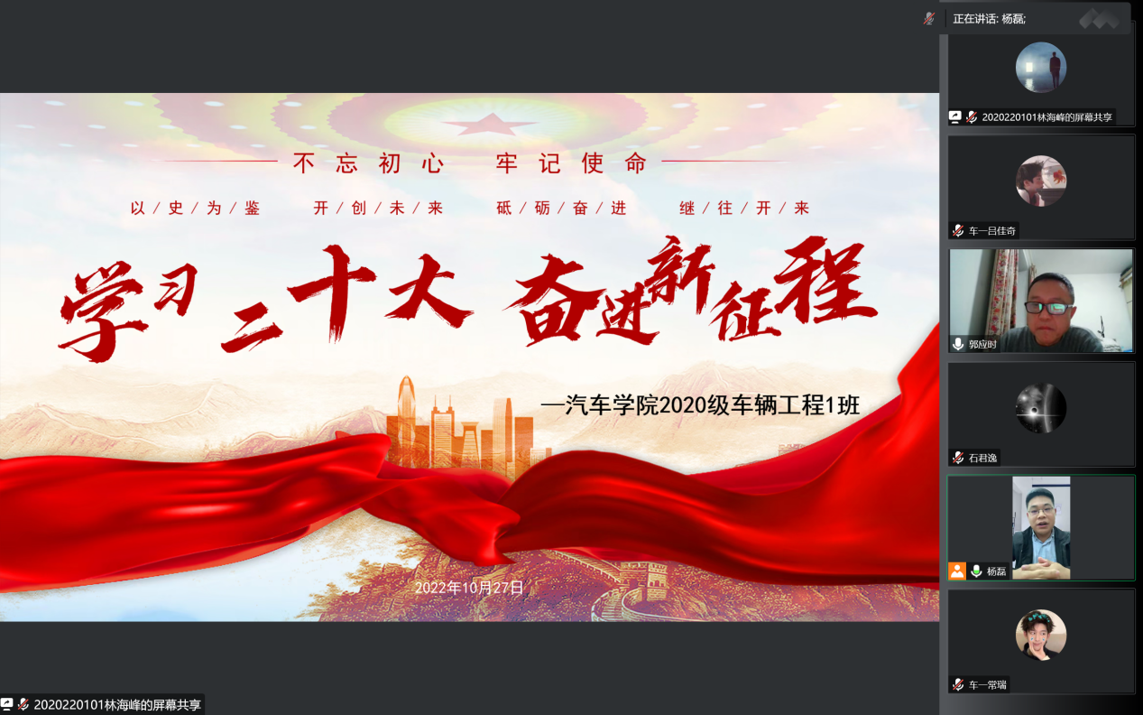 为深入学习党的二十大报告,扎实推进“三全育人”工作,精心上好疫情防控思政大课,10月27日,无限动漫 2020级车辆工程一班举行“学习二十大,奋进新征程”线上主题班会。院长郭应时教授出席本次班会,班会由2020级辅导员杨磊主持。