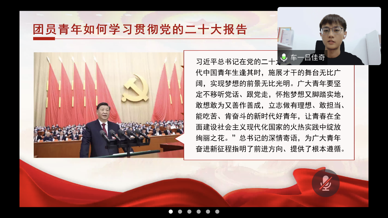 车辆一班班长林海峰从人员构成、活动开展、获奖情况、班级特色等几个方面介绍了班情概况;吕佳奇同学从大会历史背景、报告主要内容、青年的使命与担当三个方面领学了党的二十大报告;白睿钰、曹一凡、薛紫薇、冀攀四名同学分享了自己的学习感悟和收获,表示将以此次主题班会为契机,深入学习党的二十大报告,踔厉奋发、勇毅笃行,努力交出新时代新征程的最美青春答卷。