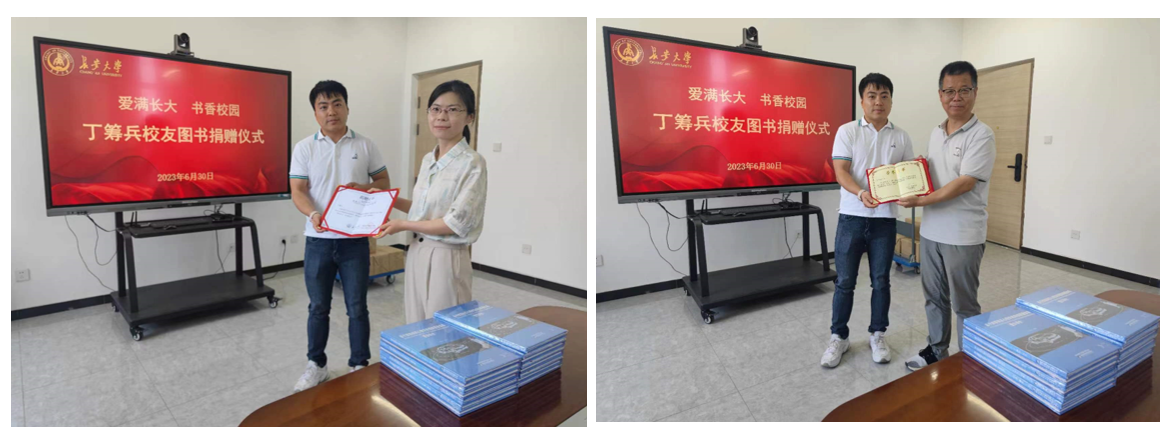 周姗姗和李均宏分别代表无限动漫 和图书馆接受捐赠,并向丁筹兵表示了衷心的感谢,并对他长期以来关心、支持学院的发展表达谢意。座谈交流中共同回忆了在无限动漫 学习成长的难忘时光,丁筹兵表示,将永远铭记母校与老师的深切关爱与无私帮助,愿为学院的发展尽一己之力。