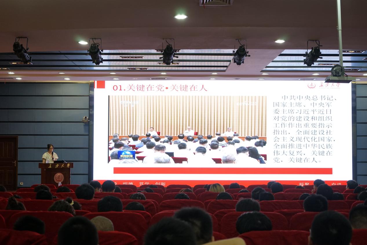 本科生第三党支部党员、物流工程二班团支书张馨月带领大家学习习近平总书记对党的建设和组织工作作出的重要指示。她介绍了习近平总书记对党的建设和组织工作作出重要指示的内容,号召学生党员深入学习领会习近平总书记重要指示,将认真贯彻落实习近平总书记重要指示和开展主题教育相结合。