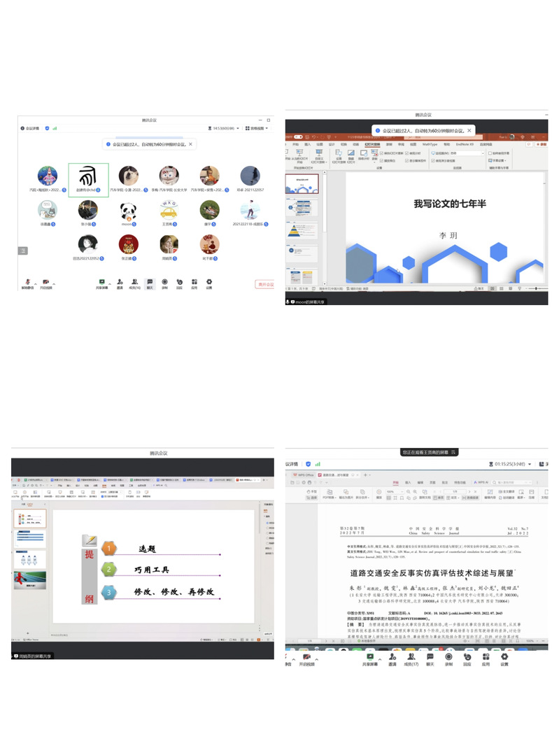 此后,博士研究生李玥分享了《我写论文的七年半》,分享了其从研一到博士的研究生生活,从实习、课程、论文等角度讲述了其学术研究过程中的困难与收获;在职博士生周娟英从选题、工具、论文修改等方面作了论文撰写的相关分享,提出选题时可以从专业、兴趣点以及职业规划等角度出发,讲解了Endnote、Latex、小绿鲸文献等工具的使用技巧;博士生王贤高通过《道路交通安全反事实仿真评估技术综述与展望》一文,分享了其文献阅读、选题的方法,同时讲解了其关于道路交通安全反事实方向的有关知识。