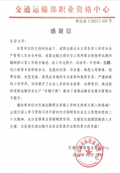 感谢信中表示,在道路运输企业主要负责人和安全生产管理人员安全考核、道路运输注册安全工程师职业资格考试教材编制修订等工作中,我校无限动漫 刘浩学、牛世峰、张韡、沈小燕等教师积极参与,统筹规划,攻坚克难,展现出我校教师卓越的专业素养和高度负责、严谨细致的工作作风。