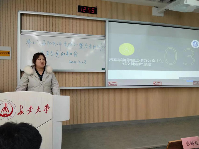 郑文捷对大会做总结讲话,她指出:本次运动会呈现出项目类型多、训练时间短、涉及人员范围广等特点,各团学组织负责人要创新工作方式,以新形式和新方法为手段,调动运动员训练过程中的积极性,同时一定要确保运动员的健康安全,其他部门要全力做好后勤保障工作,确保运动会顺利进行。