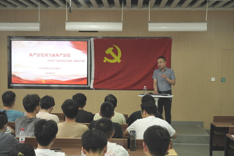 最后,林贵宝为毕业生党员作《从严治党到全面从严治党——<中国共产党纪律处分条例>的修订历程》专题党课。