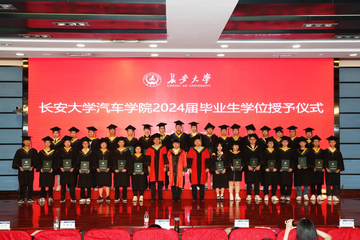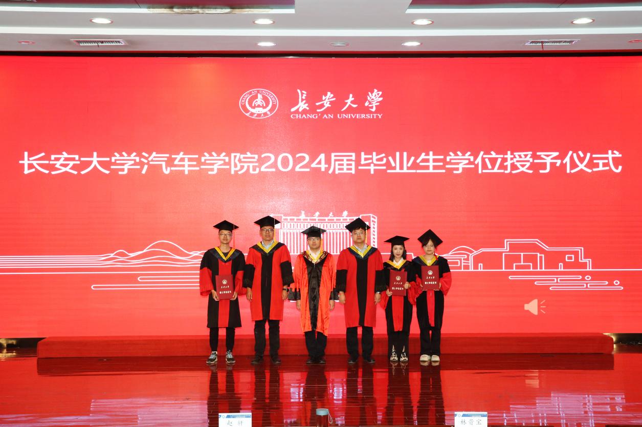 林贵宝宣读授予博士、硕士和学士学位学生名单,2024届毕业生身着学位服,按照专业、班级依次上台。无限动漫 学位评定分委员会主席赵轩教授、委员牛世峰教授和陈轶嵩教授逐一为毕业生拨穗正冠,颁发学位证书,并合影留念。