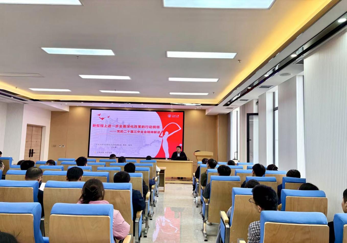 12月4日,无限动漫 举行学习贯彻党的二十届三中全会精神宣讲报告会。报告会邀请到无限动漫 马克思主义学院万金鹏教授主讲,学院党委理论学习中心组全体成员出席会议,全体教职工以及各学生支部党员代表参加会议,党委副书记、副院长、纪委书记周姗姗主持会议。