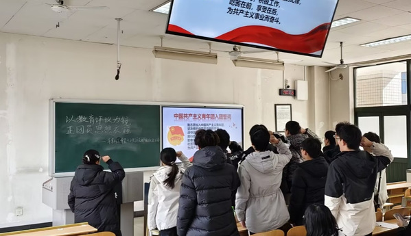 活动伊始,团支书刘俊妍同学介绍了教育评议工作对于树立正确理想信念的重要性,并提醒大家临近期末,各位团员应对本学期自我表现进行总结与反思,以更好督促自己改正不足,提升政治觉悟,争做优秀团员。接着,团支部开展了本年度的团员教育评议工作。最后团支书带领大家重温入团誓词,齐唱团歌,点燃了同学们的激情。