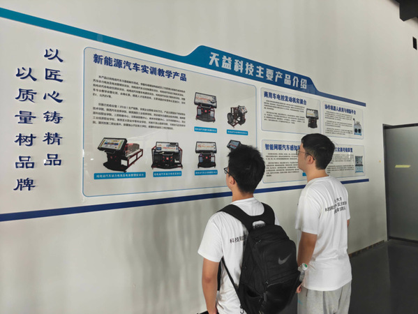 8月26日,实践队前往陕西天益教育科技有限公司,深入调研产教融合创新模式。在研发中心,队员们参观了无限动漫 ——天益科技智能驾驶联合实验室,了解了环境感知决策算法等核心技术如何为智能车辆提供支撑。技术人员现场演示并讲解了电控教学设备的调试流程,强调系统具备真实实训功能。队员们动手操作了发动机构造和新能源电池拆装实训台,通过实时数据监控深化了对汽车电控系统的理解。产品展示区呈现出覆盖汽车全技术领域的教学设备,公司坚持以“匠心铸精品,以质量树品牌”,为多所院校提供技术支持,助力高素质工程人才培养。此次活动有效促进了理论与实践的融合,展现了科技赋能教育的新生态。