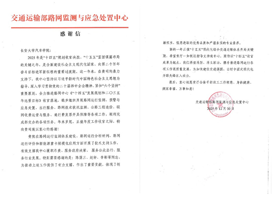 交通运输部路网监测与应急处置中心作为保障国家公路网安全畅通、统筹应急处置工作的核心部门,肩负着全国公路网运行监测、重大突发事件预警响应、公众出行信息服务等重要职责。感谢信中明确表示学院在路网运行监测体系建设、路网运行分析研判、路网运行评价和新能源重卡规模化应用等方面充分发挥学科优势、科研实力与人才储备优势,为中心服务政府决策、服务公众出行、服务行业发展提供了有效支撑。